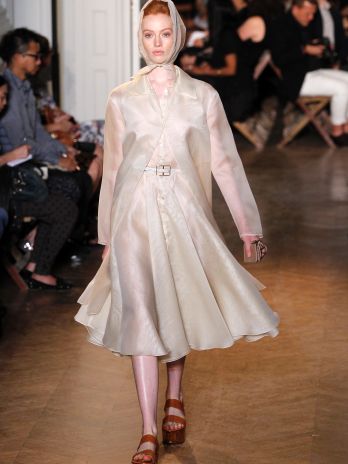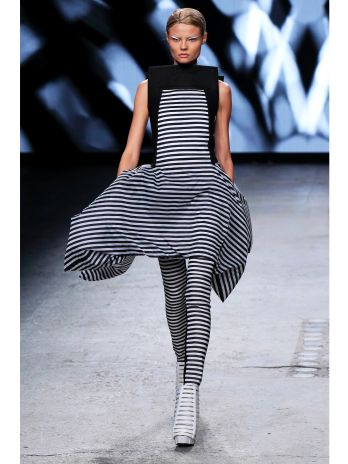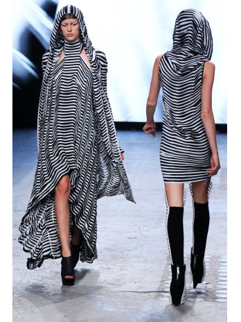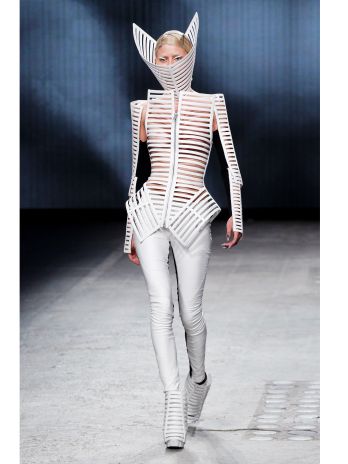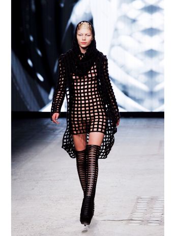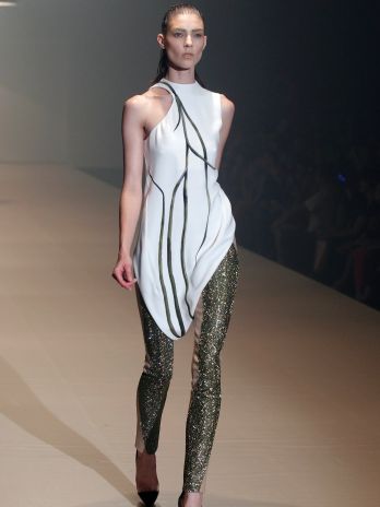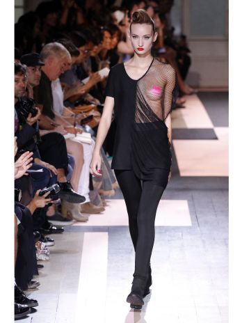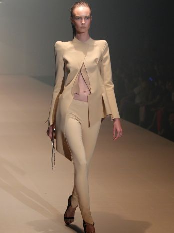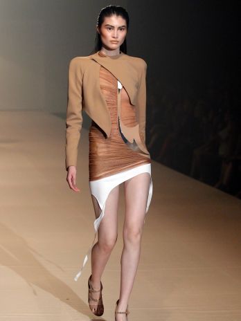 No lugar de Jane Russel e Hedy Lamarr, ou de Betty Lago e Lauren Hutton, a musa é Lady Gaga. Em vez dos glamorosos vestidos justos, muitos rasgos e recortes. Restam a sala com passarela e fortes luzes do teto e as cores sensuais, os nudes típicos de outro mito da moda dos 1980, Azzedine Alaia.